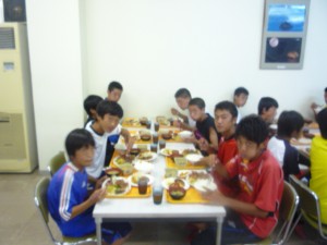 タイトなスケジュールで疲れ切った選手達。宿舎に到着は6時30頃、荷物を置き、食事の段取り、そして講演会が7時30分からなので、食事の時間が約30分!必死でご飯を食べていました。